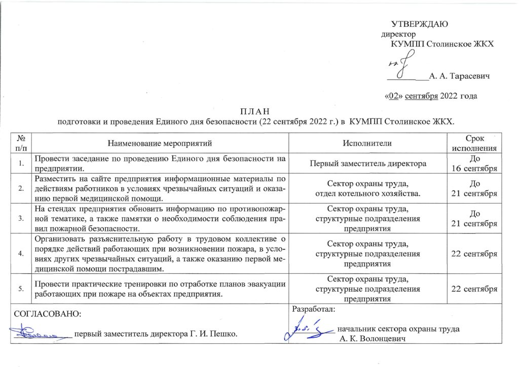 План подготовки и проведения единого дня безопасности (22 сентября 2022 г.)