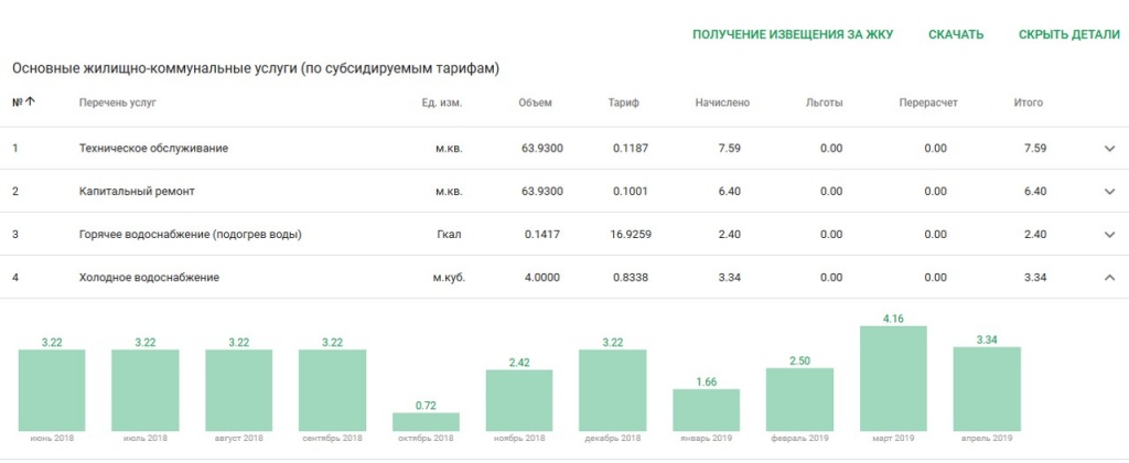 Другими словами, Личный кабинет заменит вам бумажное извещение за ЖКУ (можно скачать извещение) и даст статистику по выставленным к оплате суммам. Вы даже можете и вовсе отказаться от получения устаревших бумажных жировок — извещение придет к вам на электронную почту (отказаться от бумажных извещений может только владелец лицевого счета). Более того, можно увидеть не только детальную расшифровку потребленных ЖКУ, но и общедомовой расход.