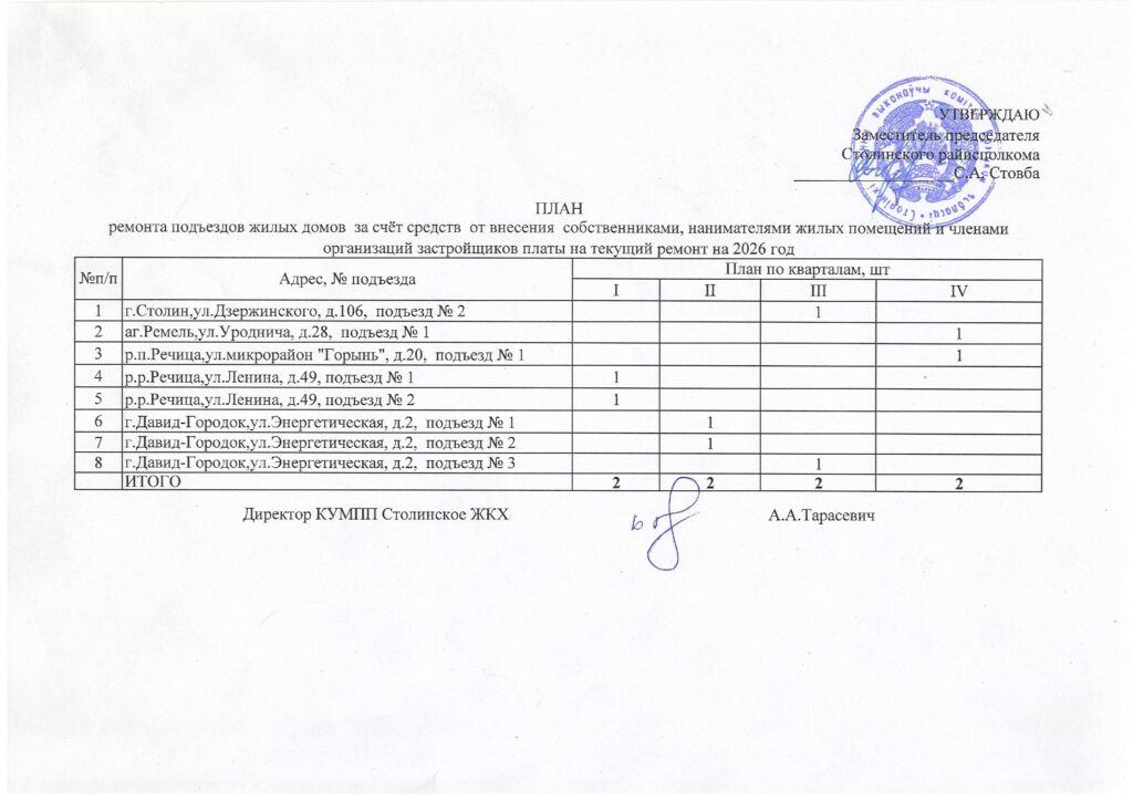 План ремонта подъездов ж/д за счёт средств от внесения собственниками платы на текущий ремонт на 2026 год
