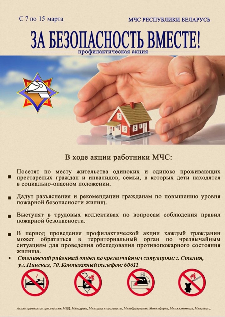 Для повышения уровня безопасности населения, активизации пожарно-профилактической работы, анализа ее эффективности и оценки готовности территорий к весенне-летнему периоду с 7 марта по 15 марта 2026 года на территории Столинского района проводится республиканская акция по предупреждению пожаров и гибели людей от них в жилищном фонде «За безопасность вместе».